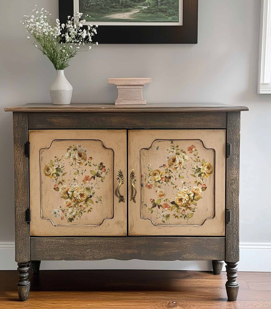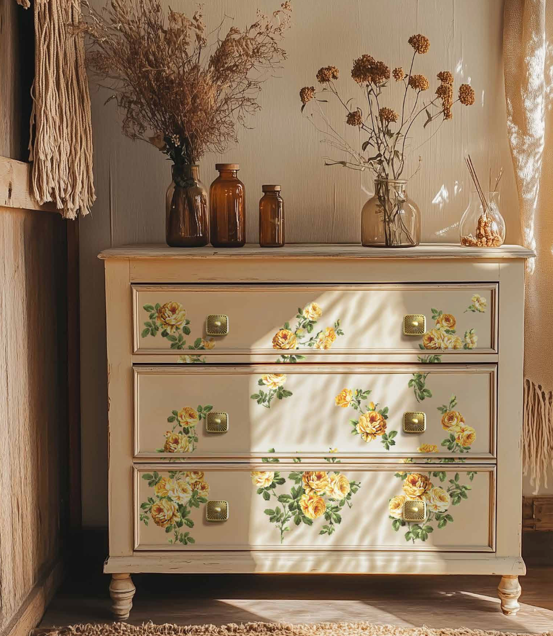 A radiant cascade of golden yellow roses takes center stage in the Bouquet de Provence Middy Transfer. This sun-drenched design features full, flourishing blooms in a rich palette of amber, honey, and pale citrus tones, accented by soft green foliage. It’s the perfect floral to brighten up furniture, entryway pieces, or kitchen cabinets with a fresh-from-the-garden feel.