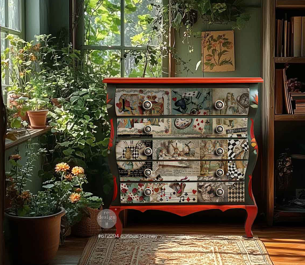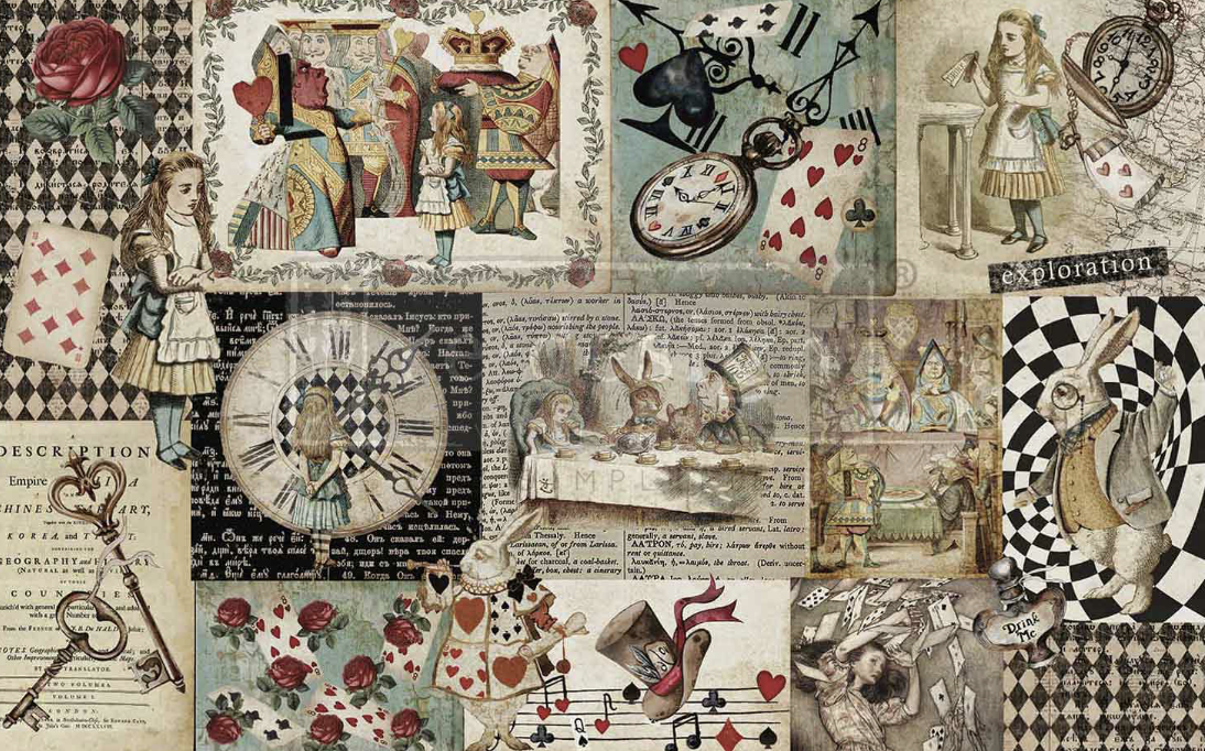 Let your creativity run wild with the "Curious Journey" Découpage Décor Tissue Paper. This design is like a scrapbook of Wonderland’s most delightful moments, pieced together in a way that brings your projects to life. From the quirky checkered patterns to the whimsical illustrations of Alice’s world, every inch of this tissue paper adds a burst of character and charm. The warm, vintage tones blend seamlessly with playful details, turning any piece of furniture or decor into a storybook wonder.