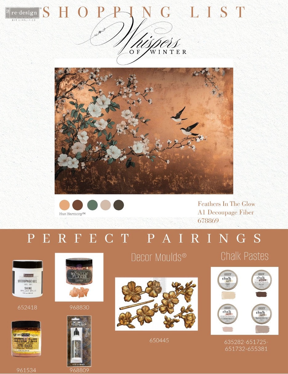 Feathers in the Glow A1 Decoupage Fiber bathes your piece in the soft shimmer of a golden-copper sunset. A radiant background—reminiscent of aged metallic foil—sets the stage for delicate white blossoms and graceful birds in mid-flight. It's rich, warm, and full of movement, making it perfect for antique dressers, focal panels, or any piece that craves a glowing, poetic touch.