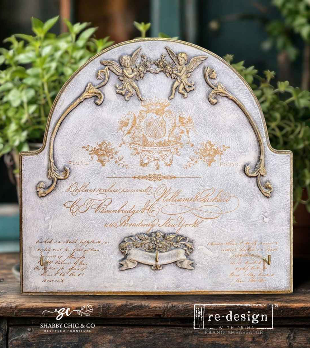 Ornate golden flourishes and antique script bring a regal touch with Maxi Décor Transfer® - Queen’s Glory. Inspired by historical manuscripts and elegant insignias, this design adds sophistication and vintage charm to furniture, decorative pieces, and artistic projects. The finely detailed text and motifs enhance painted surfaces, creating a refined, timeworn look. The two 12” x 12” sheets offer versatility, allowing the elements to be used together or separately. The classic golden tones contrast beautifully against both dark and light backgrounds, making each piece feel like an heirloom.