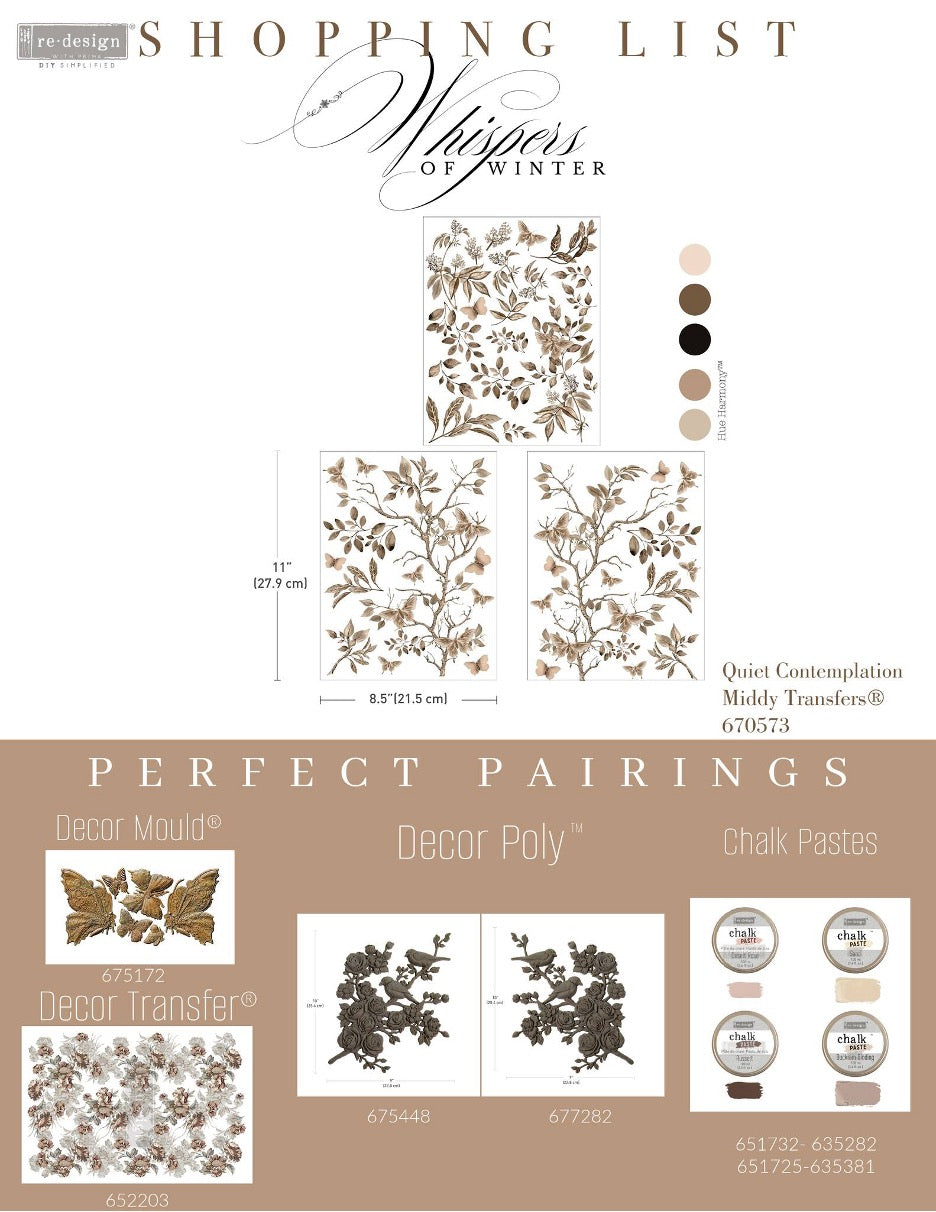 Softly falling leaves, bare branches, and gentle butterflies create the perfect autumn moment in the Quiet Contemplation Middy Transfers®. With warm sepia tones and delicate detailing, this design feels like a quiet walk through a beautiful garden. Ideal for cozy fall DIYs, seasonal furniture makeovers, or layered mixed media pieces.