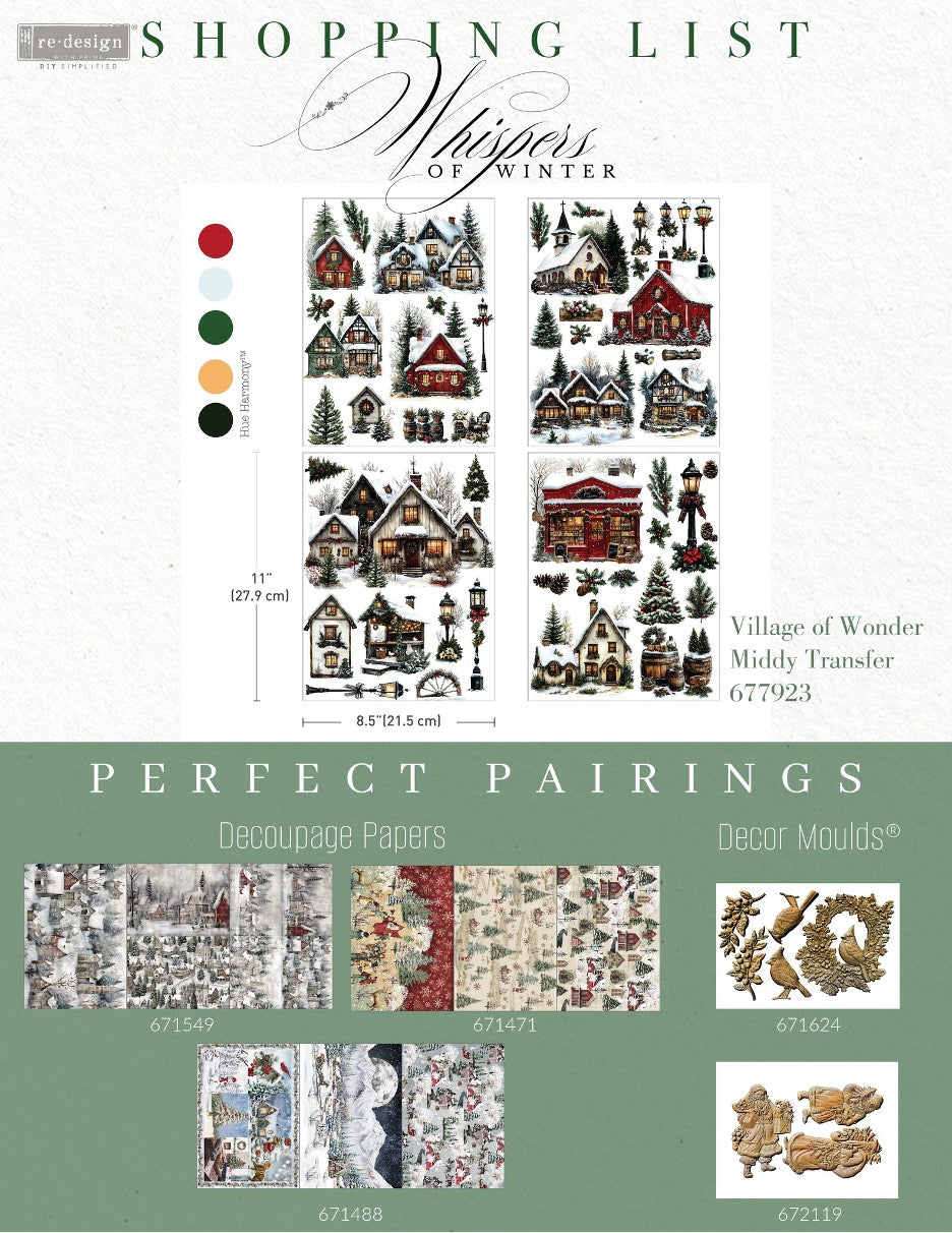 Frosted rooftops, glowing windows, and snow-dusted trees, Village of Wonder Middy Transfers® captures the magic of a holiday town just waiting to come to life. Each sheet is filled with charming cottages, cozy lanterns, pinecones, wreaths, and snowy shopfronts, all illustrated with storybook warmth and incredible detail. Perfect for creating winter scenes on furniture, signs, framed art, and more.